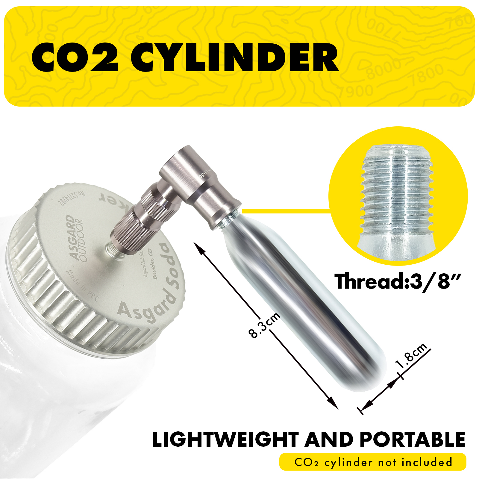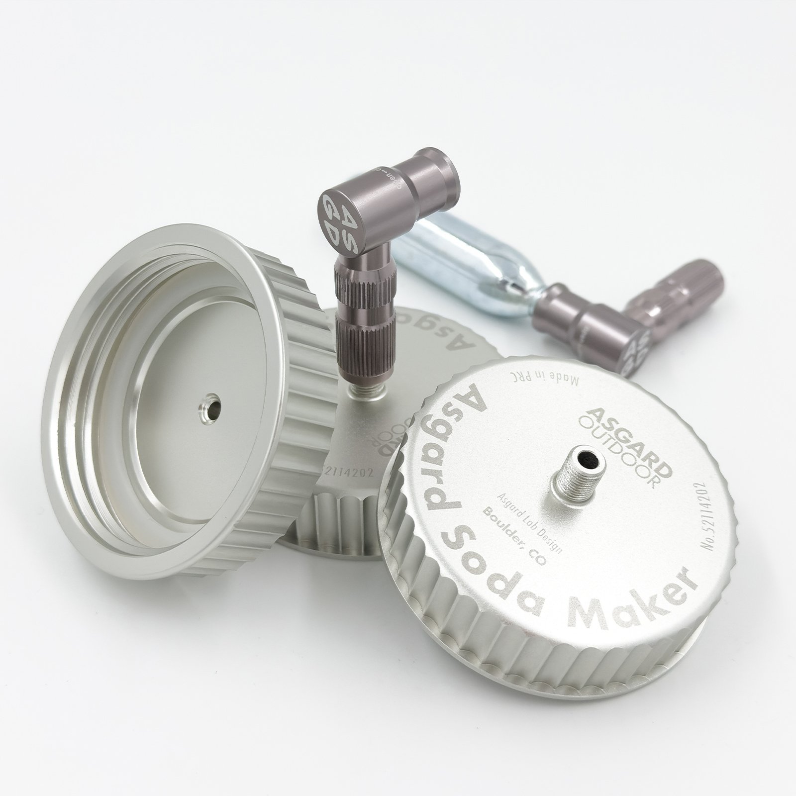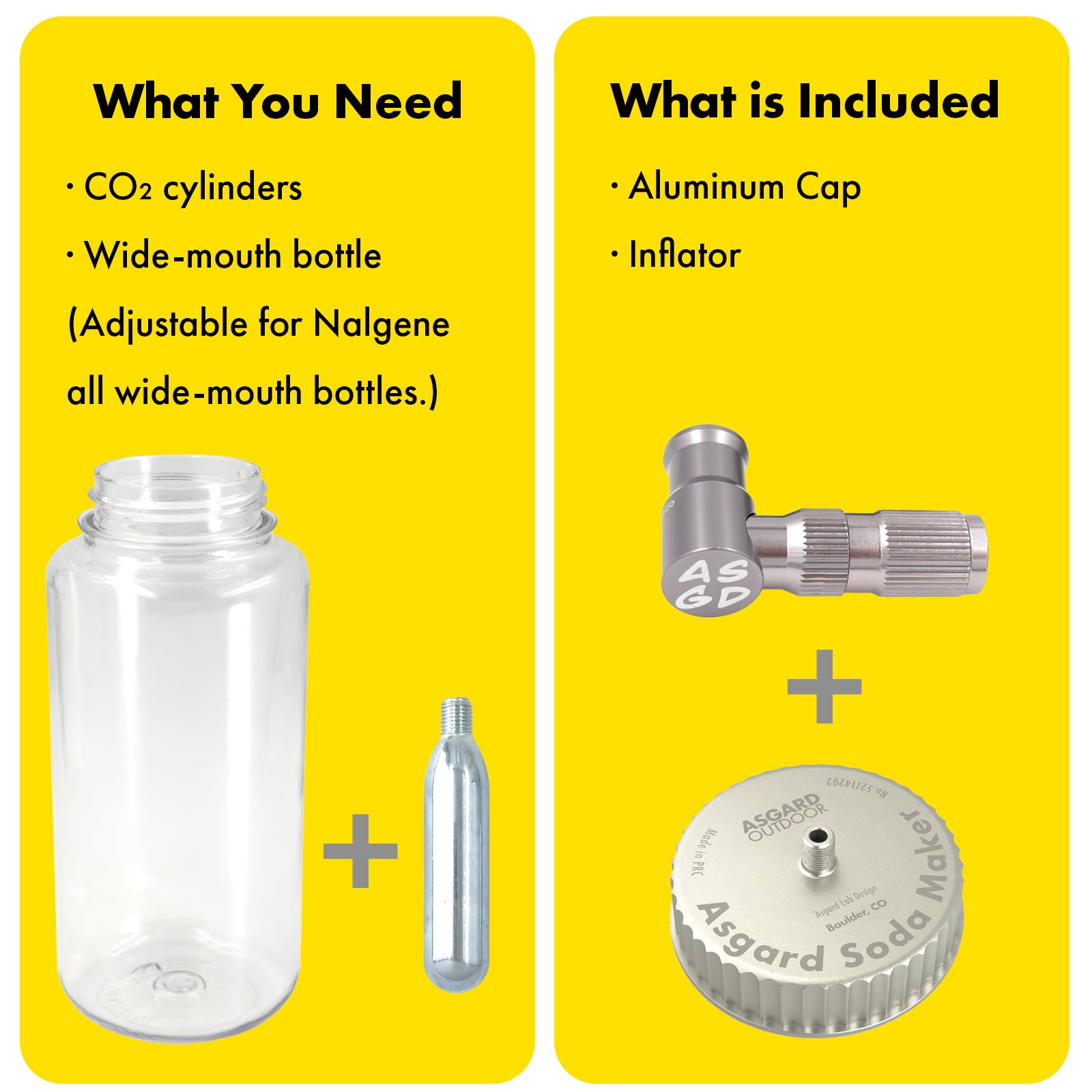 Asgard Soda Maker Kit showing needed CO2 cylinders and wide-mouth bottle, included aluminum cap and inflator
