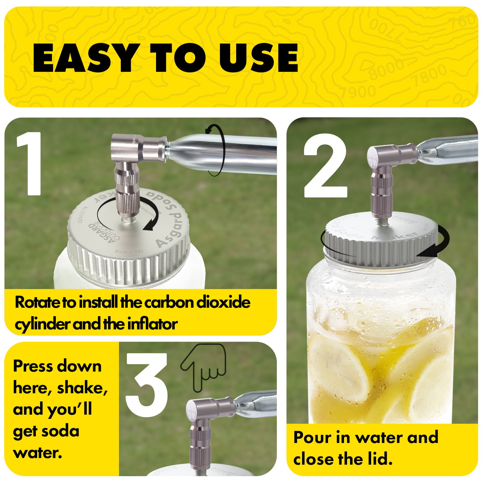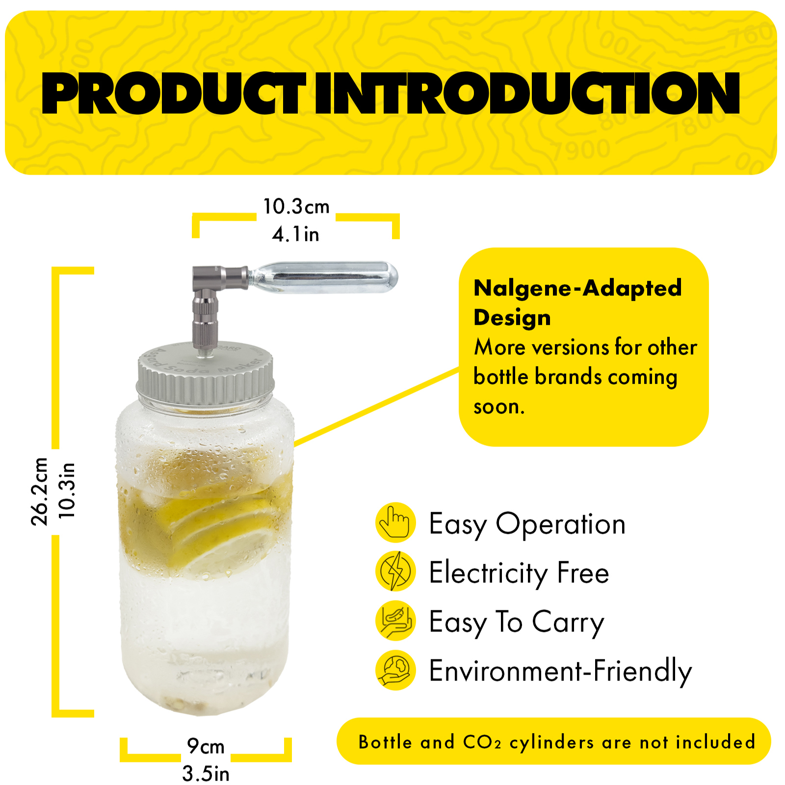 A: Fill your Nalgene wide-mouth bottle, attach a CO₂ cartridge, and carbonate in seconds.