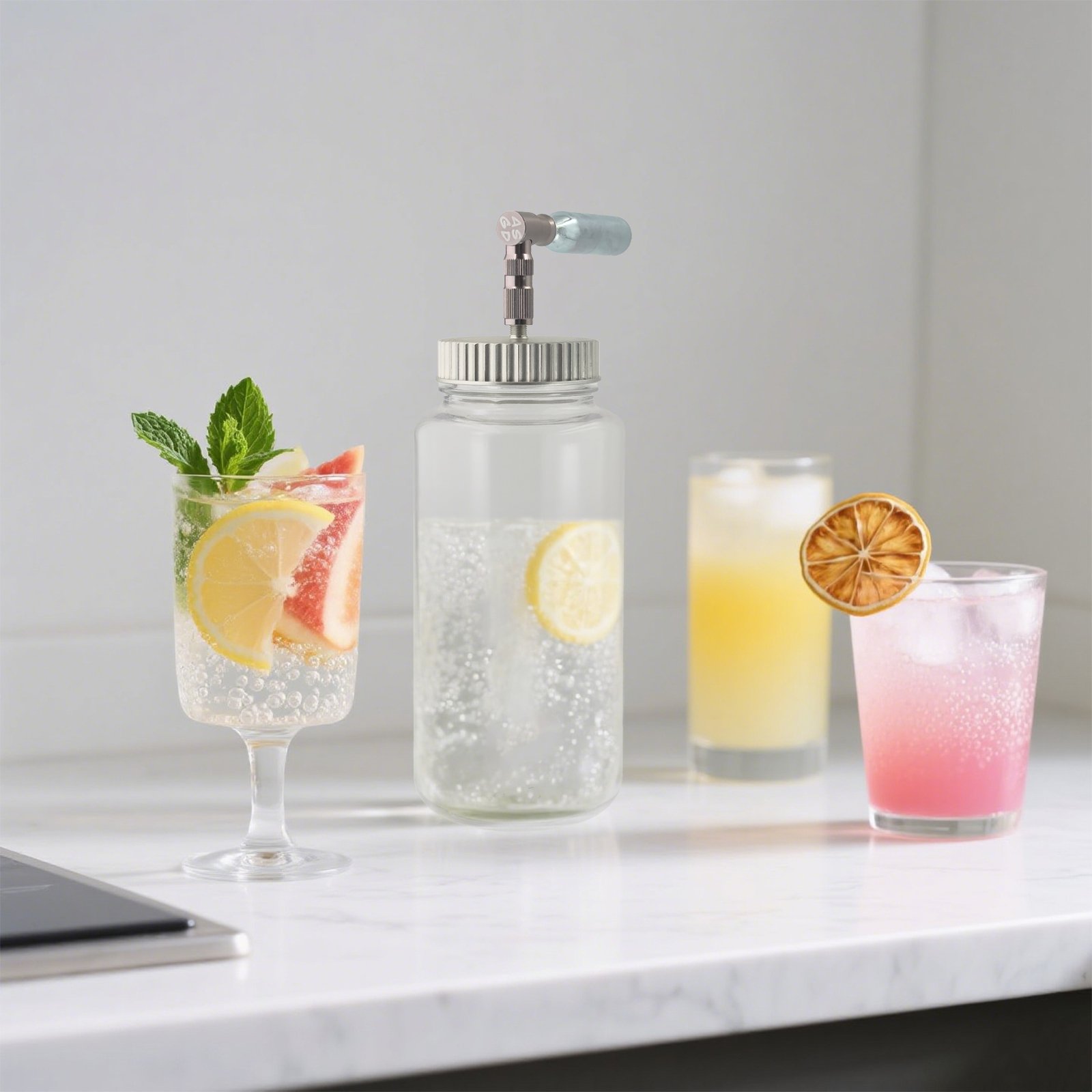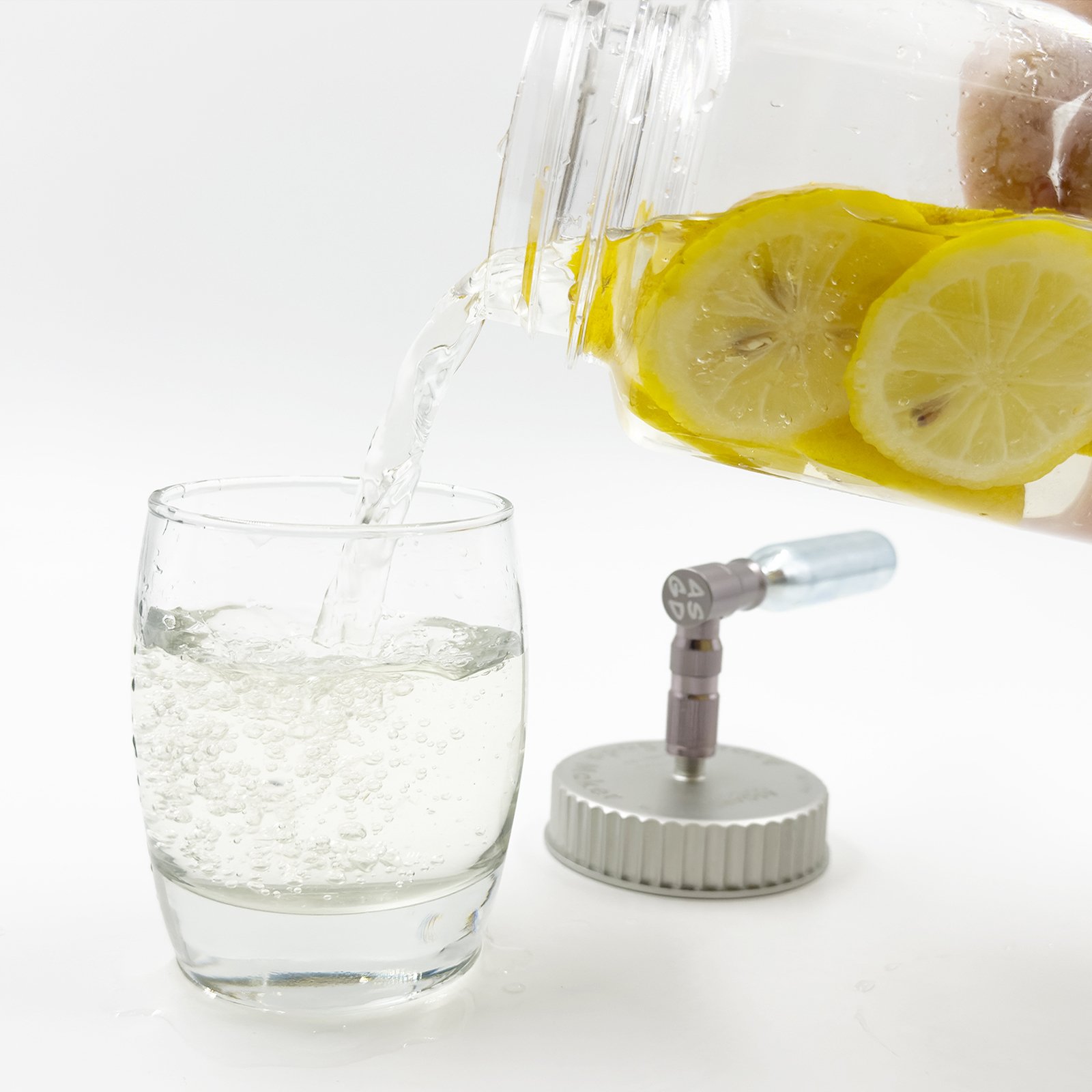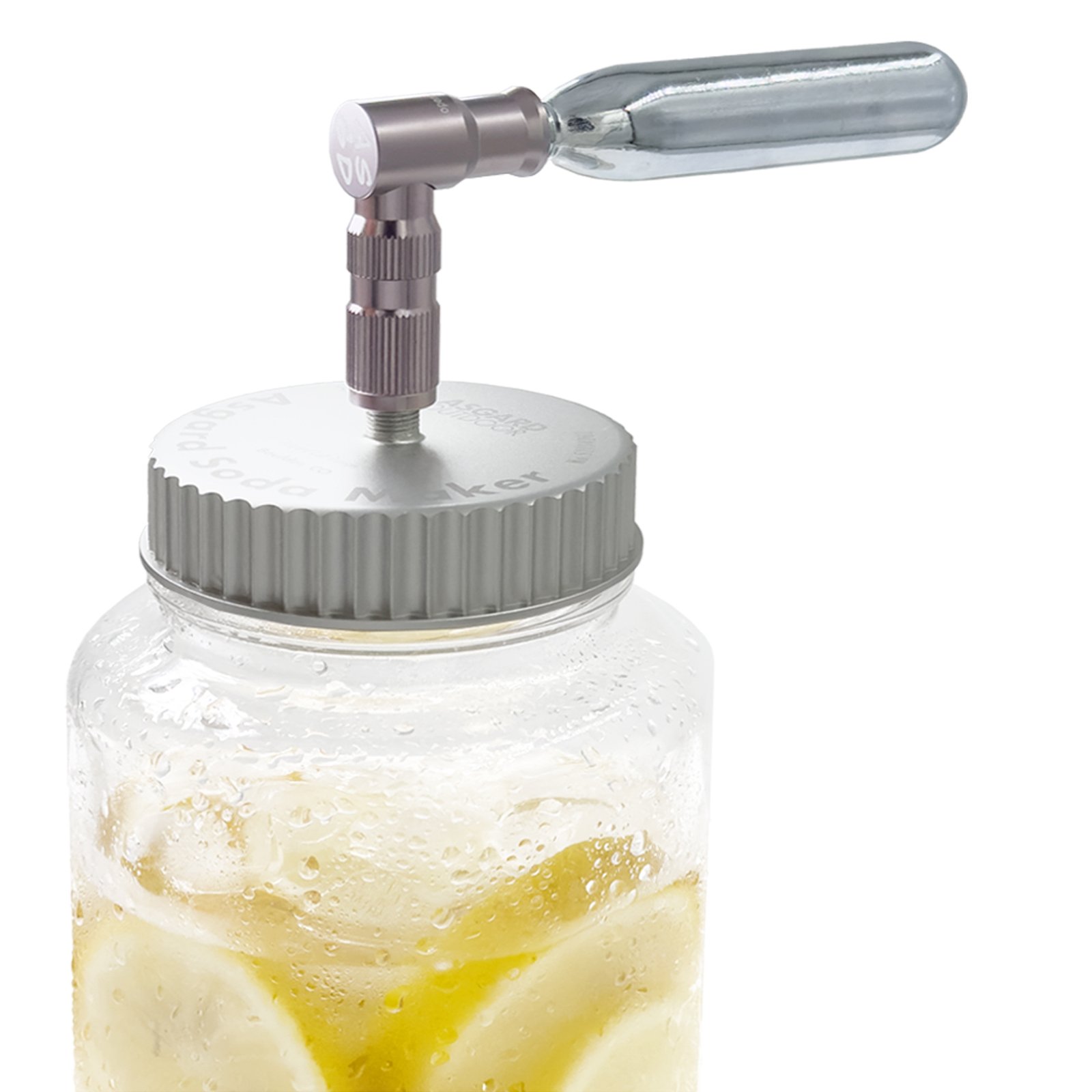 A compact soda maker cap with a CO2 cartridge attached to a jar, used for carbonating beverages outdoors or at home.