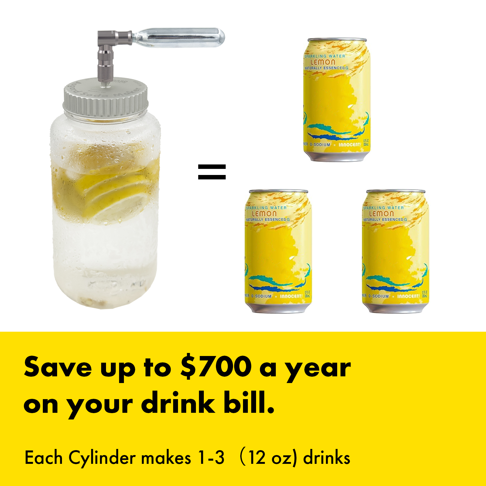 Eco-friendly device with CO2 cylinder and lemon water compared to La Croix cans