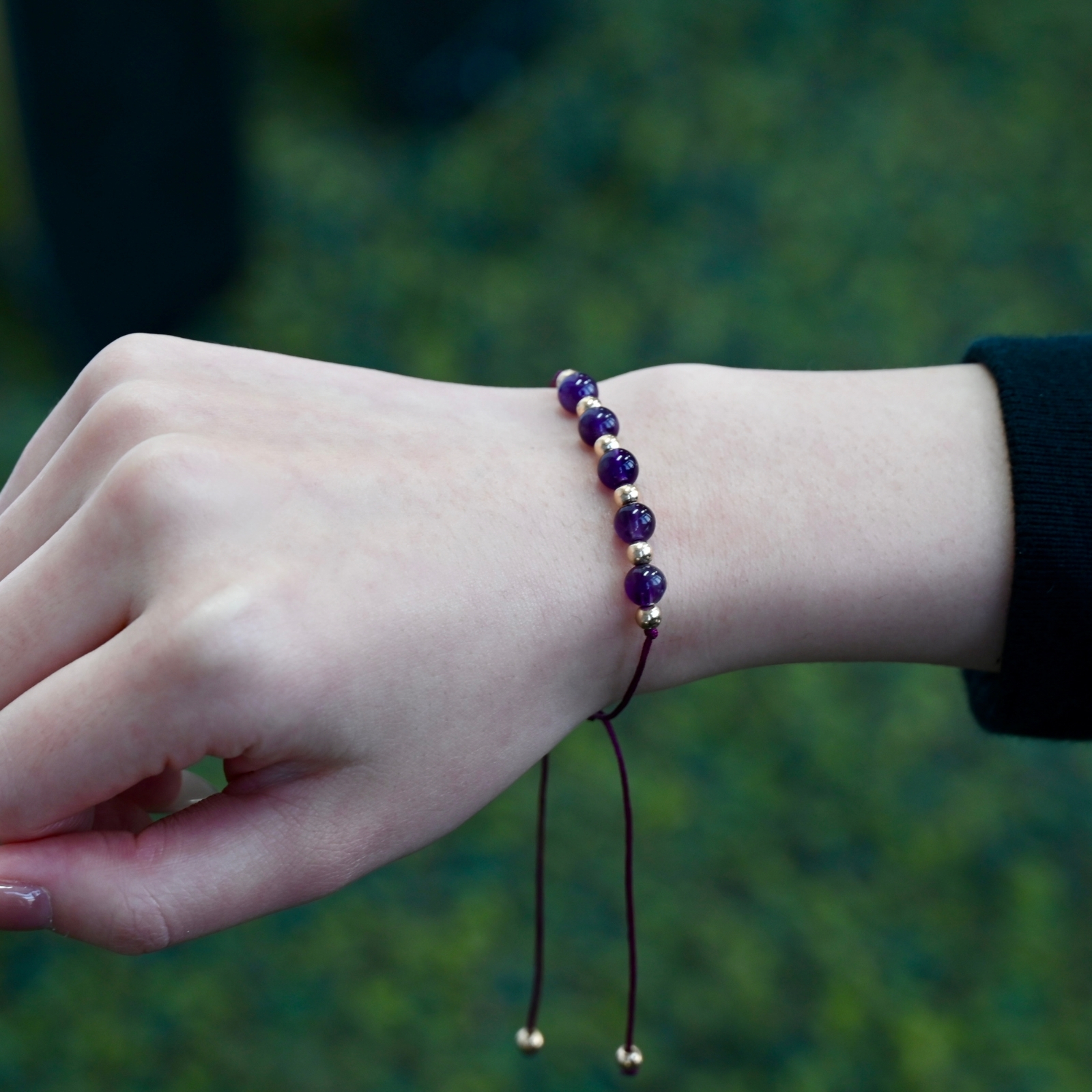 The bracelet combines deep purple mineral tones, warm gold accents, and a slim plum adjustable cord. Together, these details create a darker and calmer look inspired by twilight on the trail.